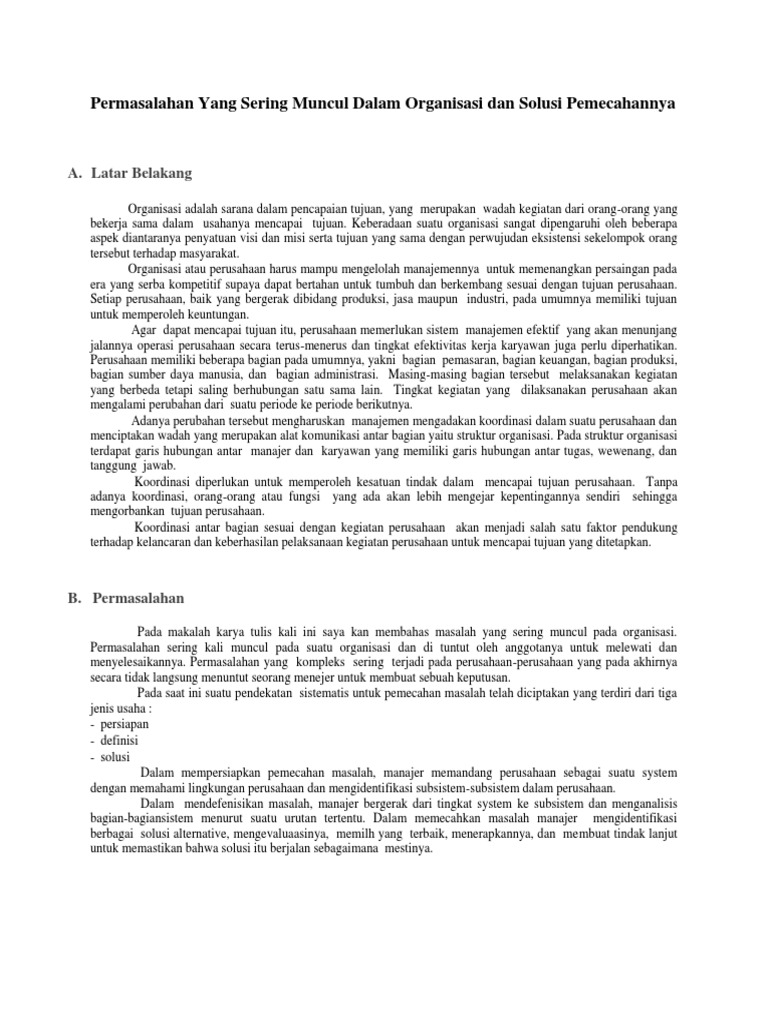 10 Masalah Dalam Organisasi : Hal ini berbeda karena setiap anggota suatu organisasi adalah unik secara biologis maupun psikologis, dan berkembang atas dasar proses belajar yang berbeda pula.. Ketika suatu permasalahan atau hambatan terjadi, manajer harus bertanggung jawab untuk menyelesaikannya. 101110378 bab 1 pendahuluan 1.1. Di dalam organisasi akan banyak orang baru yang dikenal. 9.sebagai mekanisme adaptasi terhadap perubahan. Kunci dalam pendefinisian masalah adalah mengajukan pertanyaan yang tepat untuk menemukan akar permasalahannya.