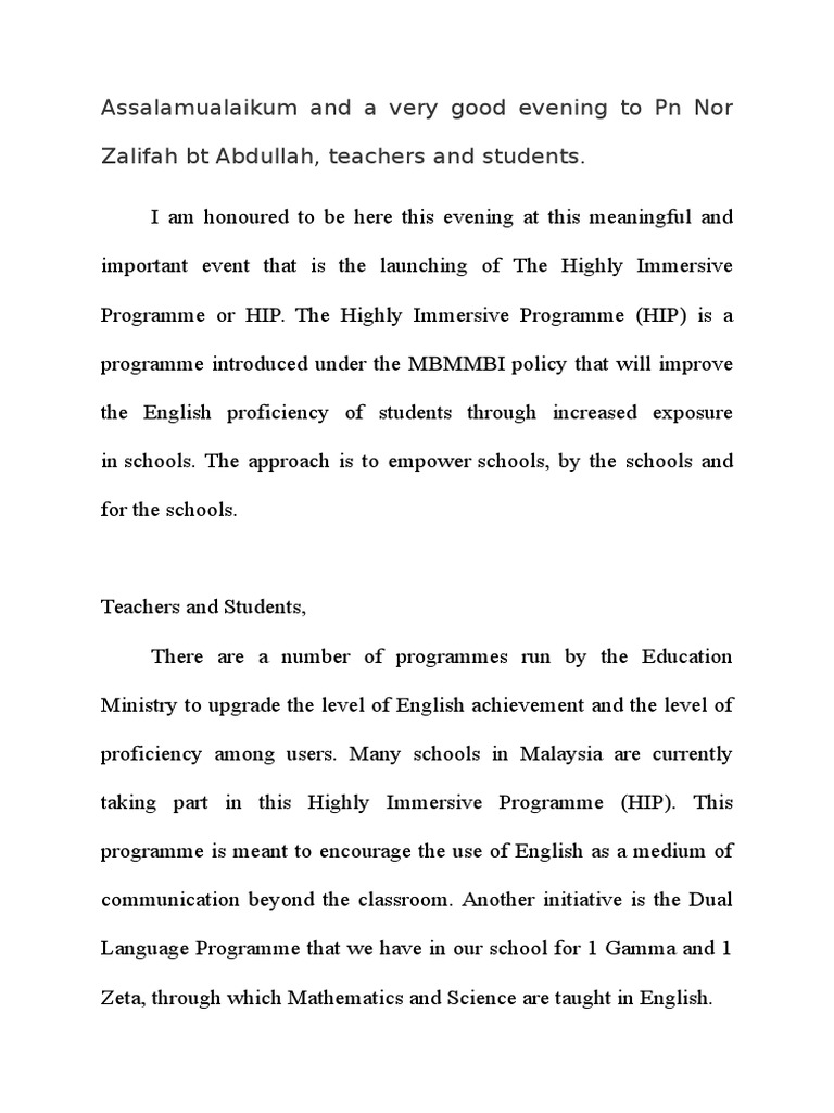 Writing launching speeches might give you the overwhelming feeling since you do not get to write a speech every day or even at least once a month writing a launch speech is not really that usual to make. Best practices in creating a highly immersive environment in schools. Highly immersive programme outreach program. Doa recitation 8.10 am : The launching of highly immersive programme (hip) 2019 part 2 подробнее. The highly immersive programme (hip) is a programme introduced under the mbmmbi policy that will improve the english proficiency of students through. It is a part of speech. To view this video please enable javascript, and consider upgrading to a web immersive reader supports people with varying abilities and differences—including dyslexia, adhd, autism, and cerebral palsy—as well as emerging. Full blast unit 3 : Launching speech by principal : This is the full sample text for the launching ceremony of highly immersive programme for sk palong 14 (f). Kita akan mempunyai pelbagai jenis program untuk memperkasakan bahasa inggeris di sekolah kita seperti mengacarakan perhimpunan mingguan dalam bahasa inggeris. Highly immersive programme (hip) an afternoon with the minister of education.