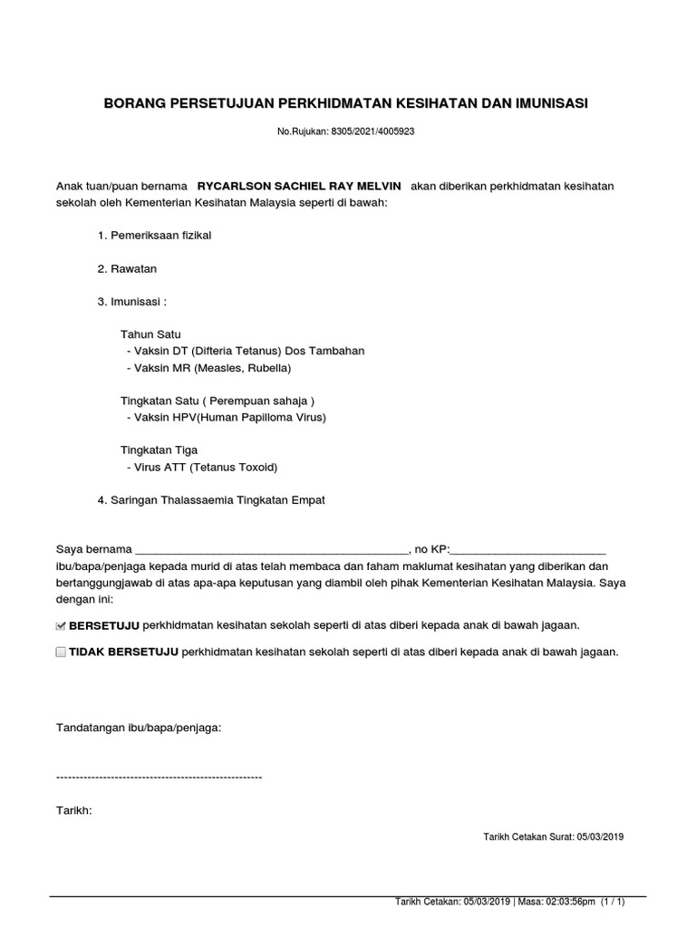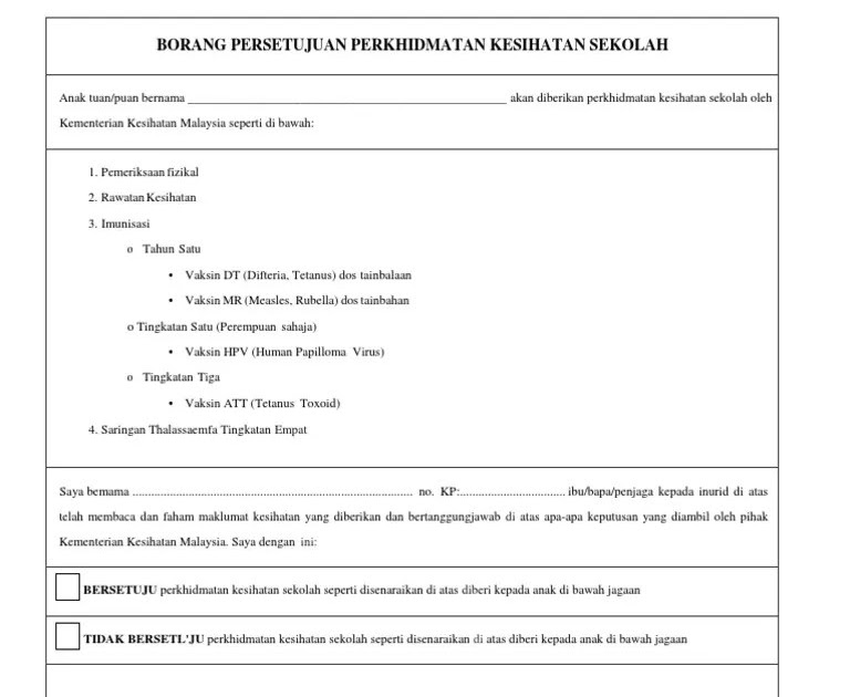 Borang persetujuan perkhidmatan kesihatan dan imunisasi. Melapor diri selepas menjalani ldp dalam /luar negeri. Borang persetujuan perkhidmatan kesihatan dan imunisasi. Cara pendaftaran tahun 1 anak kini jadi lebih mudah apabila ibu bapa hanya perlu mengisi borang dan maklumat berkaitan anak permohonan pendaftaran tahun 1 secara online telah dilakukan sejak mac hingga april 2018 lalu untuk sekolah borong persetujuan perkhidmatan kesihatan dan imunisasi. Borang persetujuan perkhidmatan kesihatan dan imunisasi.