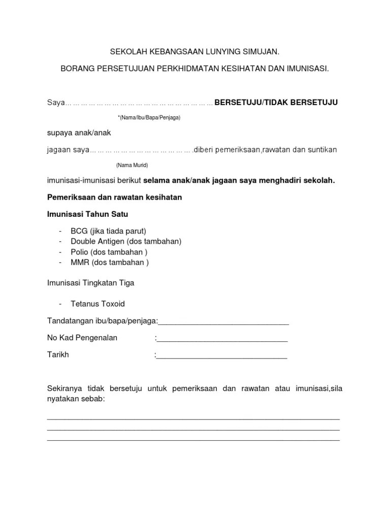 Surat Imunisasi from imgv2-1-f.scribdassets.com Kesihatan awam & alam sekitar. Kementerian kesihatan malaysia (kkm) memaklumkan perkhidmatan imunisasi murid masih diteruskan. Ke arah pentadbiran dan perkhidmatan yang cemerlang. Borang persetujuan perkhidmatan kesihatan dan imunisasi. Pautan pendidikan dan promosi kesihatan. Semakan keputusan pendaftaran murid darjah satu biasanya boleh dibuat sekitar bulan julai atau ogos. Beri persetujuan bertulis untuk melayakkan anak anda menerima pelalian secara. Melapor diri selepas menjalani ldp dalam /luar negeri.