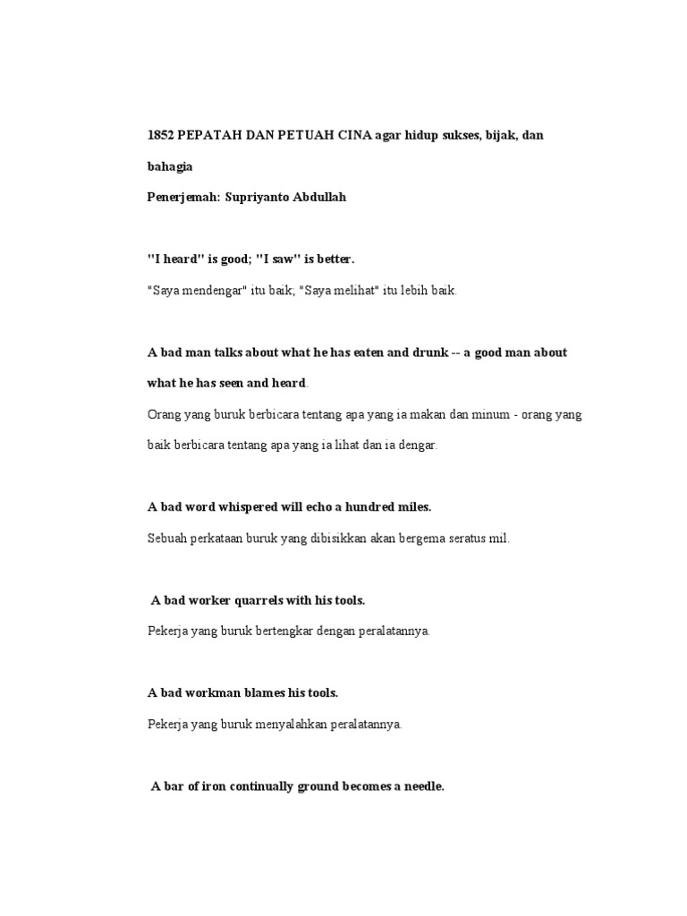 Abu nawas orang yang pandai mencari helah atau mencari alasan. Anak baik menantu molek =mendapat keuntungan yang berlipat ganda. Mudahnya membayar fidyah bersama cinta sedekah. Peribahasa untuk seseorang yang konsisten dengan ucapannya, bisa dipegang tanpa ada perubahan sedikitpun. Semua peribahasa dengan kata baik, selalu ada di situs jagokata.